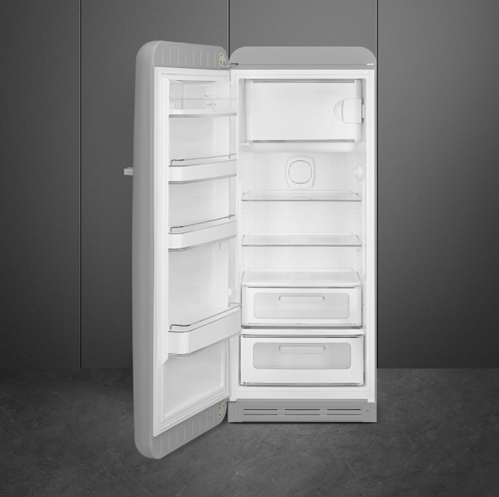 Холодильник Smeg FAB28LSV5 выполнен в серебристом цвете. Прибор прекрасно дополнит интерьер, оформленный в стиле ретро. Светодиодная подсветка ярко освещает пространство холодильной камеры. Вентилятор равномерно распределяет воздух по отделению, что гарантирует качественное охлаждение и продляет срок хранения продуктов.
