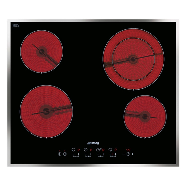 Smeg SE2641CX2 — электрическая варочная панель, изготовленная из черной стеклокерамики Suprema в стальной полированной рамке. Модель снабжена четырьмя разноразмерными конфорками Hi-Light, одна из которых имеет два нагревательных контура. Органы управления устройства можно заблокировать от случайного нажатия. Индикация остаточного тепла исключает риск получения ожогов об еще не остывшую рабочую поверхность.