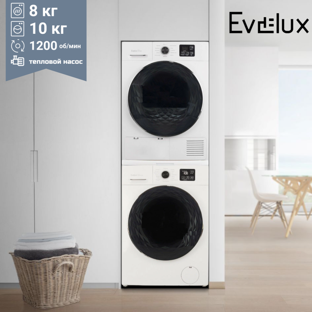 Комплект сушильная машина + стиральная машина + выдвижная полка EVELUX CWD 6060 + EW 61125 BD + ED 68001 в Улан-Удэ