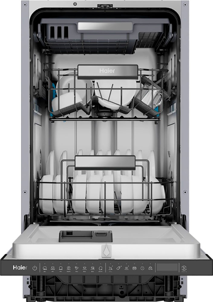 Haier HDWE11-396RU оснащена 8 программами, среди которых есть экстра сушка и замачивание. Гигиенический режим активирует мойку при 70 °C для выполнения дезинфекции. Функция отсрочки старта до 24 ч и блокировка панели позволяют запускать ПММ в любое удобное время. Верхний разбрызгиватель гарантирует эффективность мойки при полной загрузке камеры.
