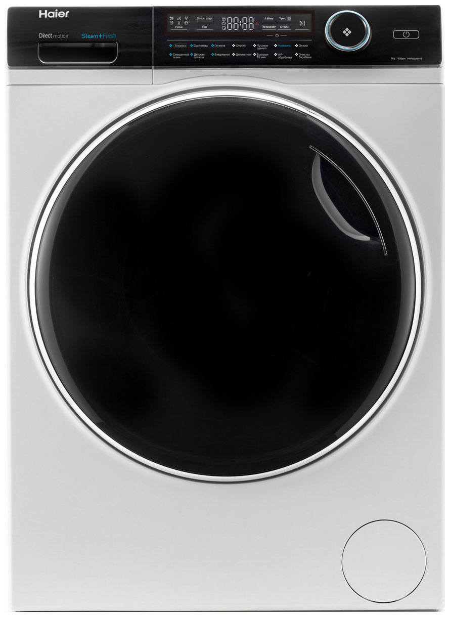 Стиральная машина Haier HW90-B14979 выделяется стильным оформлением и широкими функциональными возможностями. Данная модель предусматривает загрузку до 9 кг белья и оснащена 14 автоматическими программами, среди которых отмечаются функции обработки паром и UV-обработки. На панели управления расположены дисплей, сенсорные кнопки и поворотный механизм.